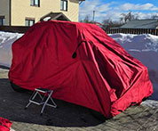Транспортировочный тент-чехол из синтетической, ветро- и влагонепроницаемой ткани Оксфорд с пропиткой. Этот материал более плотный и крепкий чем «таффета», имеет увеличенный срок службы (более 5 лет). Чехол имеет ленты и карабины для надежной фиксации чехла при транспортировке. Его можно использовать как зимой так и летом, в гараже и на открытом воздухе. Вес изделия около 2,5 кг, габариты в сложенном состоянии 40х20х20 см. Чехол возможен в исполнении двух видов тканей плотностью 240 и 600 den.